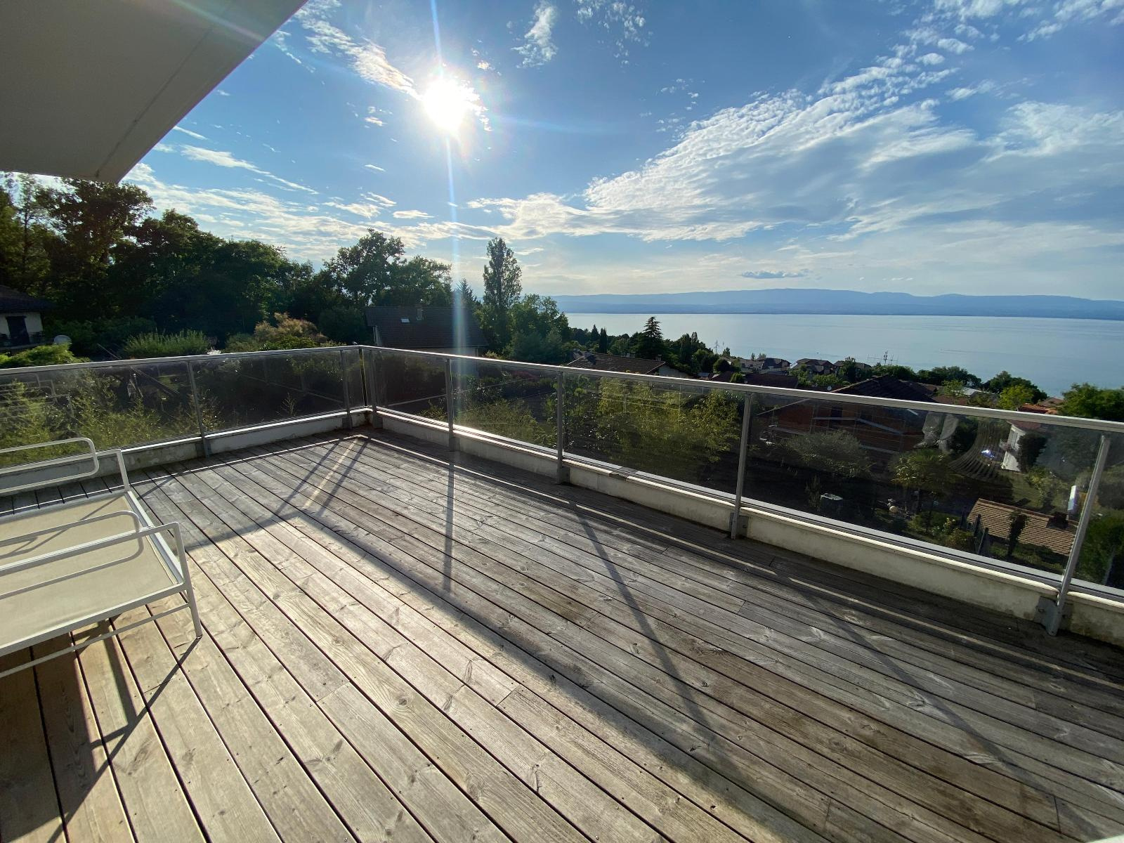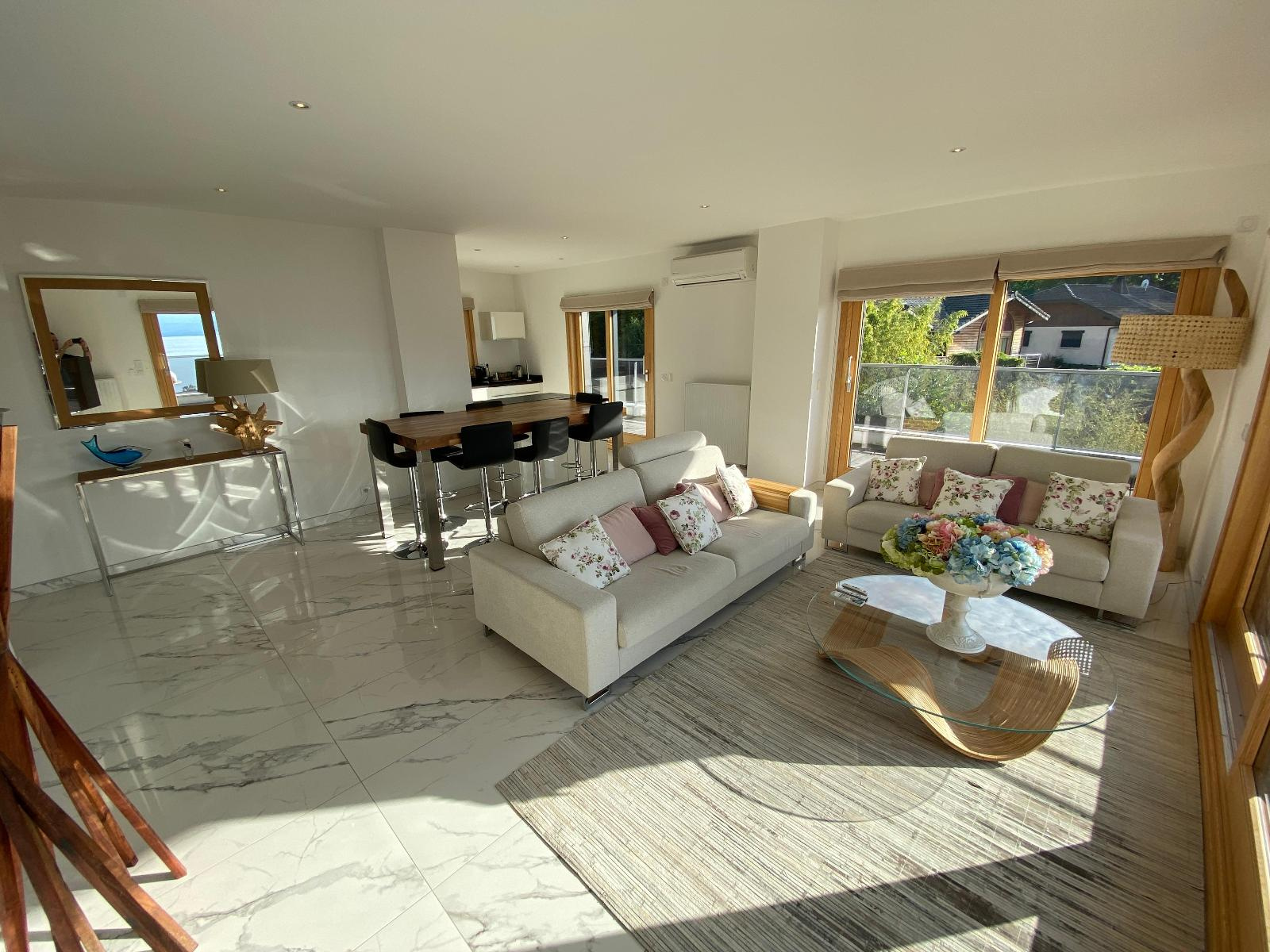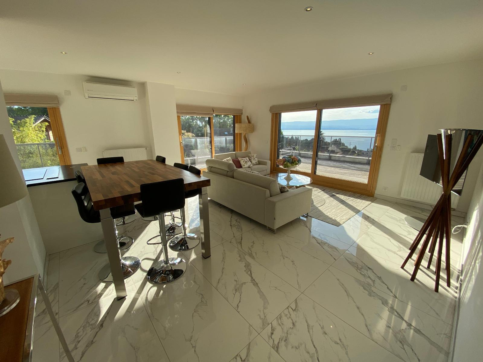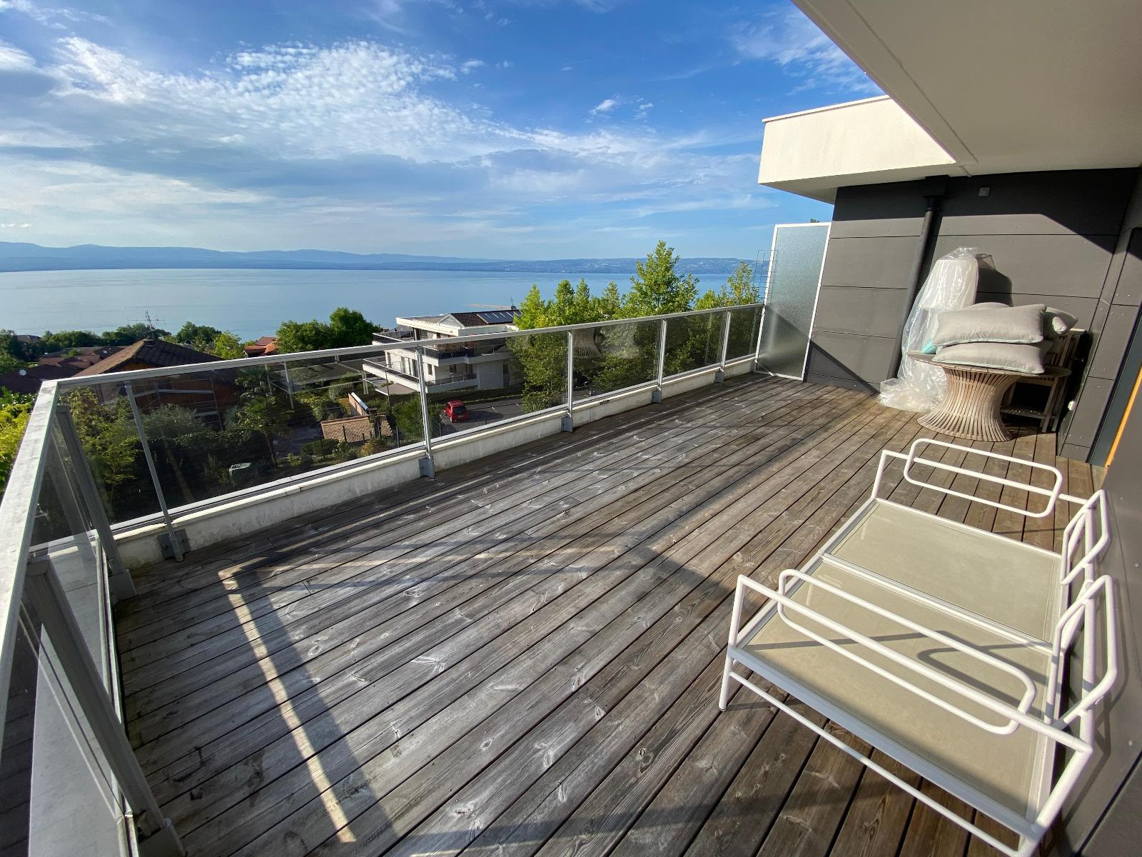 Entrée/couloir, magnifique cuisine équipée ouverte sur séjour avec accès terrasse de 36.70 m² et vue exceptionnelle et panoramique lac, 3 chambres dont 1 avec accès douche/wc/dressing, 2ème douche et 2ème wc.