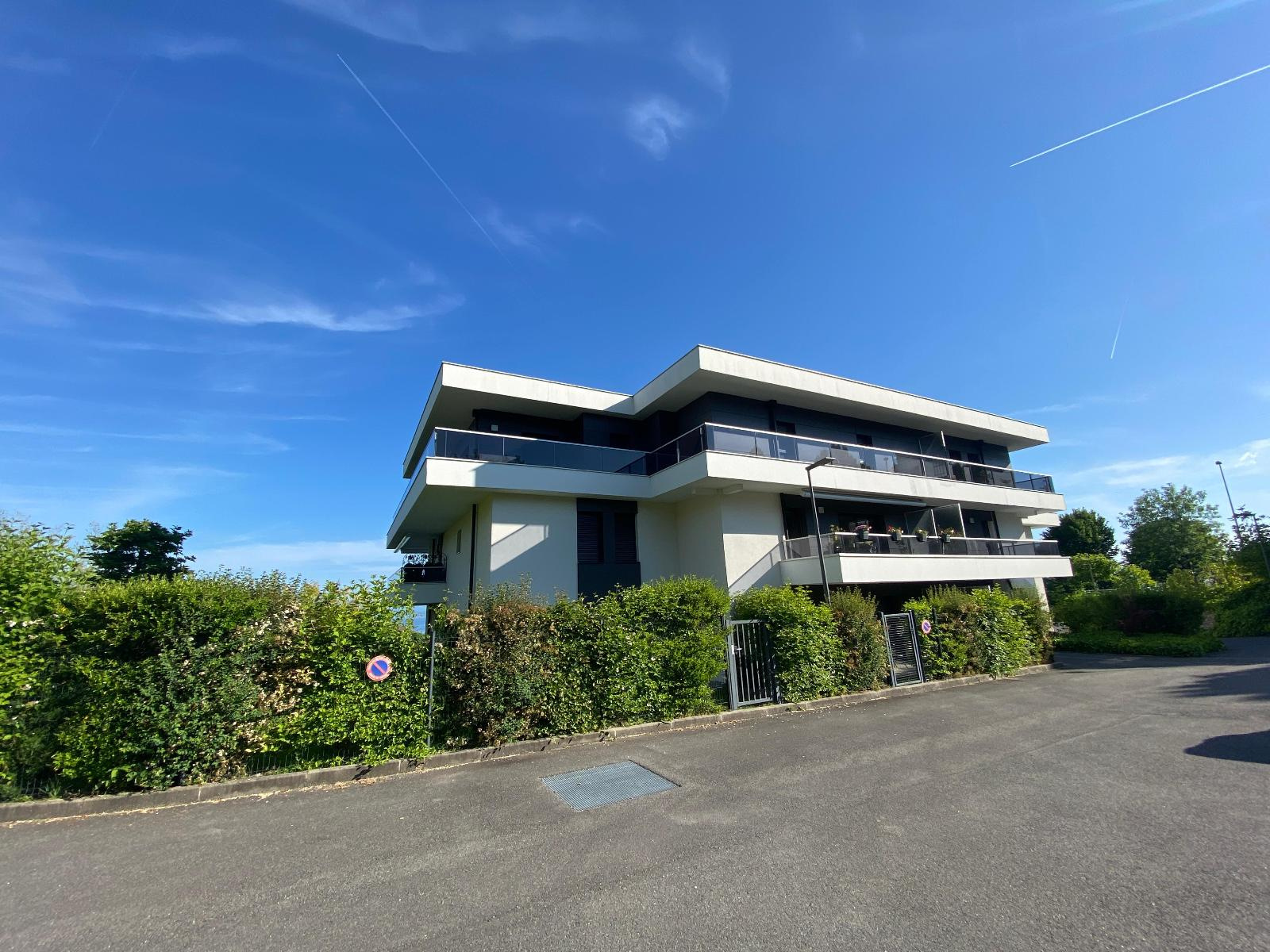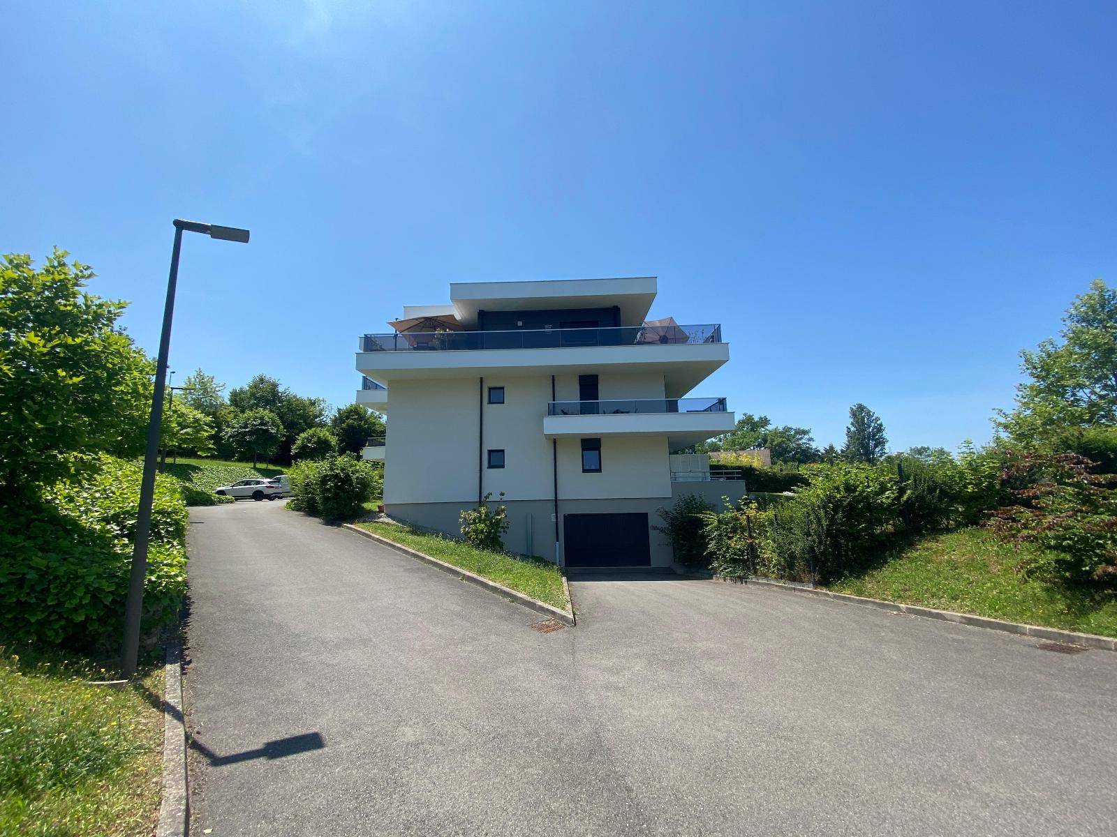 Rare à la location ! - 6, route du monastère à Evian, sur les hauteurs, au calme absolu, dans résidence récente et convoitée "L'OPUS", appartement T4 de 100.26 m² entièrement meublé avec goût au 2ème et dernier étage (avec ascenseur) comprenant :