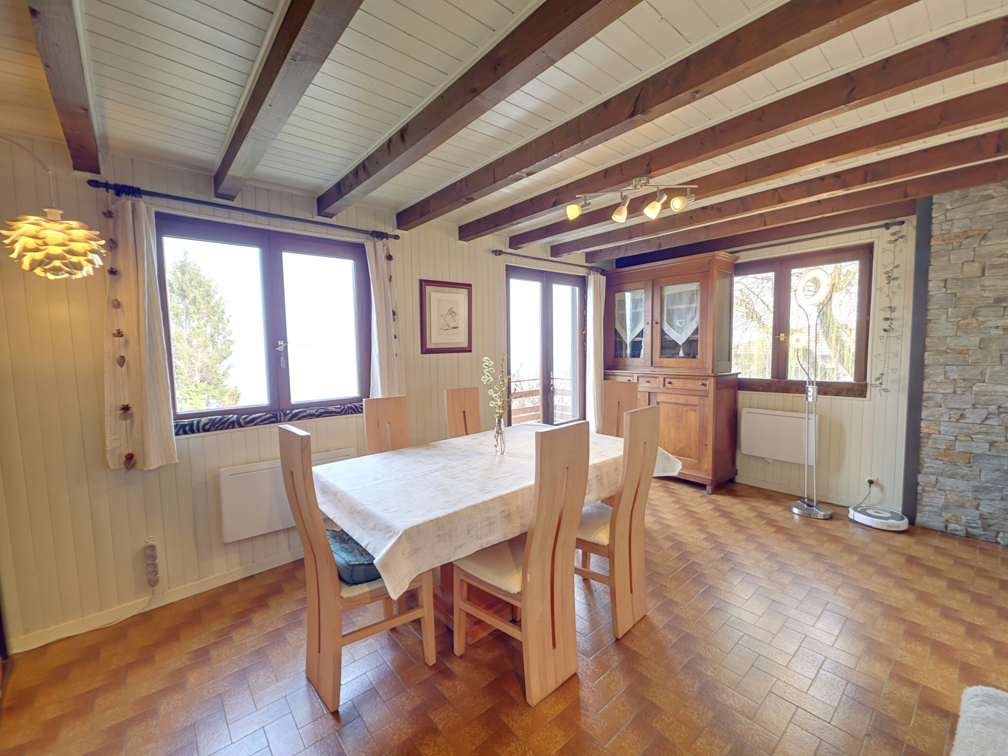 Sur la commune d'EVIAN LES BAINS, vue imprenable sur le Lac Léman pour ce chalet de 101m² utiles dont 90m² carrez sis 1191m² de terrain. Le jardin est paysagé de divers arbres fruitiers et dispose de plusieurs places de stationnements extérieures. Répartit sur 3 niveaux, il se compose: au rez : un hall, une cuisine séparée, un séjour et une salle à manger avec un balcon qui entoure le chalet et sa terrasse plein Sud, une suite parentale avec sa salle de bains privative et son dressing, vue Lac, un WC. Au 1er étage: une mezzanine avec de nombreux rangements, deux chambres dont une avec balcon au Sud, une salle d'eau douche et WC. Un sous-sol total complète ce bien, avec une 4ème chambre et salle d'eau douche, WC. Le système de chauffage est alimenté par des radiateurs électriques ainsi qu'un poêle à bois, double vitrage et volets bois battants. Dpe: E - GES: B - Si vous souhaitez investir dans un bien avec une vue magnifique et de l'espace tant extérieur qu'intérieur, venez découvrir ce beau chalet. Contactez l'agence BARNOUD Evian pour le visiter.